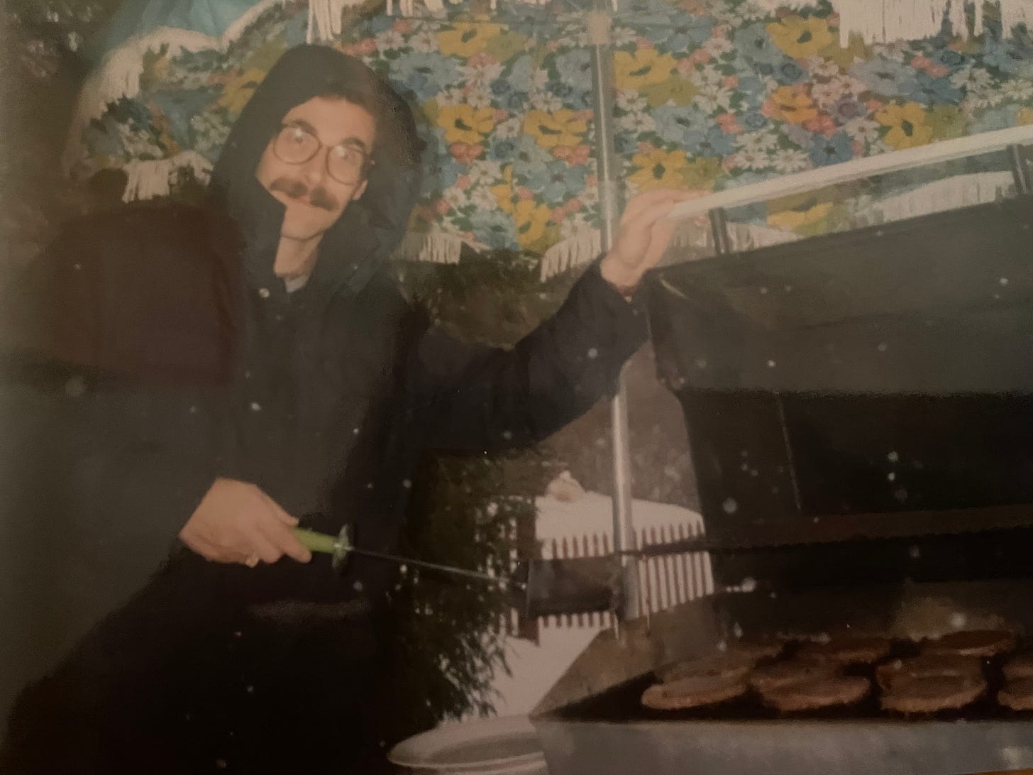 That three-day storm also inspired our infamous Blizzard Barbecue. After days of snow and ice kept everyone indoors and in solitary confinement, we were hungry for company and amusement. Once Bruce was sure he could dig out our car and get to the market (and that it was open) for supplies, we phoned all of our immediate neighbors and invited them for burgers and hot dogs and whatever potluck items they wanted to contribute. You know how you often get a pregnant pause when you ask if someone would like to come over—that interval where they consider alternative options and/or whether they feel like socializing? Not this time! Without hesitation, everyone said YES, bringing everything from wine to Girl Scout cookies. Bruce erected the outdoor table umbrella over the grill to protect the food from the still-falling snow. Our guests came around six. The adults stayed until 11. The younger set hung out until two in the morning. Definitely one of our most successful and appreciated gatherings.